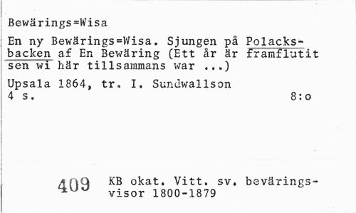 //// Bewärings=Wisa //// En ny Bewärings=Wisa, Sjungen på Polacksbacken af En Bewäring (Ett år är framflutit sen wi här tillsammans war .,.) //// Upsala 1864, tr. I. Sundwallson 4 s. 8:0 //// -nn KB okat. Vitt. sv. bevärings- //// 4UU , yisor 1800-1879 ////