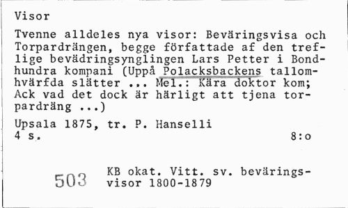 //// Visor //// Tvenne alldeles nya visor: Beväringsvisa och Torpardrängen, begge författade af den tref-lige bevädringsynglingen Lars Petter i Bond-hundra kompani (Uppå Polacksbackens tallom-hvärfda slätter ... töeT.: Kära doktor kom; Ack vad det dock är härligt att tjena tor-pardräng ...) //// Upsala 1875, tr. P. Hanselli 4 s. 8:0 //// „~ n KB okat. Vitt. sv. bevärings- //// 5ÖO visor 1800-1879 ////