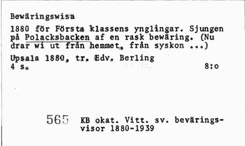 //// Bewäringswisa //// 1880 för Första klassens ynglingar. Sjungen på Polacksbacken af en rask bewäring. (Nu drar wi ut från hemmet* från syskon ...) //// Upsala 1880, tr. £dv. Berling 4 s. 8:o //// Rft9 KB okat. Vitt. sv. bevärings- //// visor 1880-1939 ////
