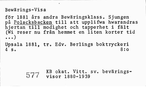 //// Bewärings-Visa //// för 1881 års andra Bewäringsklass. Sjungen på Polacksbacken till att upplifwa hwarandras hjertan till modighet och tapperhet i fält (Wi reser nu från hemmet en liten korter tid //// Upsala 1881, tr. Edv. Berlings boktryckeri 4 s. 8:o //// r»™^ KB okat. Vitt. sv. bevärings- //// ? / / visor 1880-1939 ////