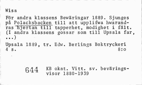 //// Wisa //// För andra klassens Bewäringar 1889. Sjunges på Polacksbacken till att upplifwa hwarand-ras hjertan till tapperhet, modighet i fält. (I andra klassens gossar som till Upsala far, //// Upsala 1889, tr. Edw. Berlings Boktryckeri 4 s. 8:o //// R4.4 okat. Vitt. sv. bevärings- //// U visor 1880-1939 ////
