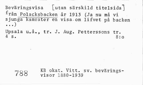//// Beväringsvisa [utan särskild titelsida"] //// från Polacksbacken år 1913 (Ja nu må vi sjunga kamrater en visa-om lifvet på backen //// Upsala u.å., tr. J. Aug. Petterssons tr. 4 s. 8:0 //// ^00 KB okat. Vitt. sv. bevärings- //// lOÖ visor 1880-1939 ////