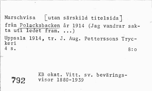 //// Marschvisa j^utan särskild titelsida] //// från Polacksbacken år 1914 (Jag vandrar sakta uti ledet fram. ...) //// Uppsala 1914, tr. J. Aug. Petterssons Tryckeri //// 4 s . 8:o //// ^00 KB okat. Vitt. sv. bevärings- //// lOÖ visor 1880-1939 ////