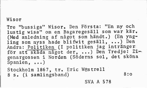 //// Wisor //// Tre "bussiga" Wisor. Den Första: "En ny och lustig wisa" om en Bagaregesäll som war kär. (Med anledning af något som händt.) (En yngling som nyss hade blifwit gesäll, ,..) Den Andra: Politiken (I politiken jag intränger för att skåda något der, ,..) Den Tredje: Zi-genargossen i Norden (Söderns sol, det sköna Spanien, ...) //// Stockholm 1867, tr. Eric Westrell 8 s. (i samlingsband) 8:0 //// SVA A 5 78 ////