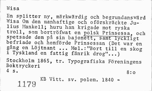 //// Wisa //// En splitter ny, märkwärdig och begrundanswärd Wisa Om den manhaftige och oförskräckte Julius Mankell; huru han krigade mot ryska troll, som bortröfwat en polsk Prinsessa, och spetsade dem på sin bajonett, samt lyckligt befriade och hemförde Prinsessan (Det war en gång en Löjtnant ... Mel.:"Bort till en skog i Tyskland en fattig fänrik drog"...) //// Stockholm 1865, tr. Typografiska Föreningens Boktryckeri //// 4 s. 8:0 //// KB Vitt. sv. polem. 1840 - //// 1179 ////