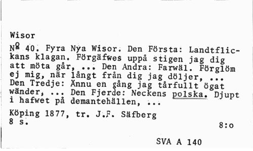 //// Wisor //// N- 40. Fyra Nya Wisor. Den Första: Landtflic-kans klagan. FörgäfweS uppå stigen jag dig att möta går, ... Den Andra: Farwäl. Förglöm ej mig, när långt från dig jag döljer, ... Den Tredje: Ännu en gång jag tårfullt ögat vänder, ... Den Fjerde: Neckens polska. Djupt i hafwet på demantehällen, ... //// Köping 1877, tr. J.F. Säfberg 8 s. 8:o //// SVA A 140 5 ////
