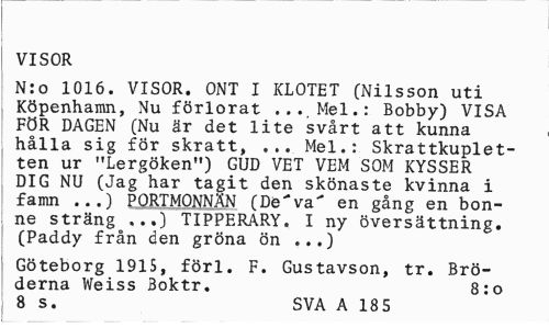 //// VISOR //// N:o 1016. VISOR. ONT I KLOTET (Nilsson uti Köpenhamn, Nu förlorat ... Mel.: Bobby) VISA FÖR DAGEN (Nu är det lite svårt att kunna hålla sig för skratt, ... Mel.: Skrattkupletten ur "Lergöken") GUD VET VEM SOM KYSSER DIG NU (Jag har tagit den skönaste kvinna i famn ...) PORTMONNÄN (Dö'va' en gång en bonne sträng ...) TIPPERARY. I ny översättning. (Paddy från den gröna ön ...) //// Göteborg 1915, förl. F. Gustavson, tr. Bröderna Weiss Boktr. 8:0 8 s. SVA A 18 5 ////