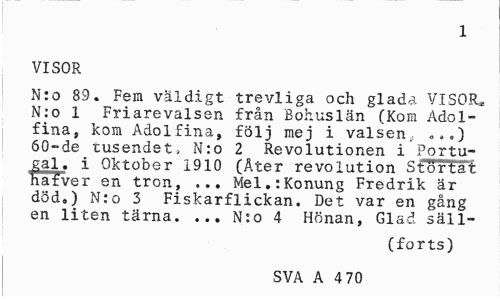 //// 1 //// VISOR //// N:o 89. Fem väldigt trevliga och glada VISOR. N:o 1 Friarevalsen från Bohuslän (Kom Adolfina, kom Adolfina, följ mej i valsen, „».) 60-de tusendet, N:o 2 Revolutionen i Portugal. i Oktober 1910 (Äter revolution Störtat hafver en tron, ... Mel.:Konung Fredrik är död.) N:o 3 Fiskarflickan. Det var en gång en liten tärna. ... N:o 4 Hönan, Glad säll- //// (forts) //// SVA A 4 70 ////