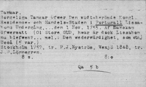 //// TaTTtear. //// ^or^rliga Tankar Ofwer Den wid t-berömde Kongl; Residenae- och Handels-Staden i Portuyall Ljssa-^ona Undergång,..,den 1 Eov. 1755 • Af Banskan Öfwersatt (Oi Store GUD, hwar är dock Lissabon nu blefwen?.,. mel.; Den wederwärdighet, som etc j Uooå ( c* var, ) //// Stockhclm 1757, tr. P.J.Nyström, Wexjö 1848, tr. J . P.X-önnegren, //// 8 a . 8;o //// Q» 5 b ////
