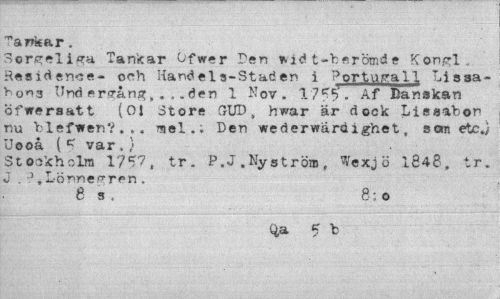//// ""artsar. //// Sorceliga Tankar Ofwer Den widt-bsrömde Kon^l. Residence- och Handela-Staden i PortugalI Li ssa-hons Und ers-ång, . , .den 1 Nov. 1755. Af Banakan öfweraatt (01 Store GUD, hwar är dock Lisaabon nu blefwen?... mel,; Den wederwardighet, som etc,} Uooå (c var,} //// Stockholm 1757, tr. P.J .Nyström, Wexjö 1648, tr. J,J,Lönnepren. //// 8 s . 8: o //// Q,a 5 b ////