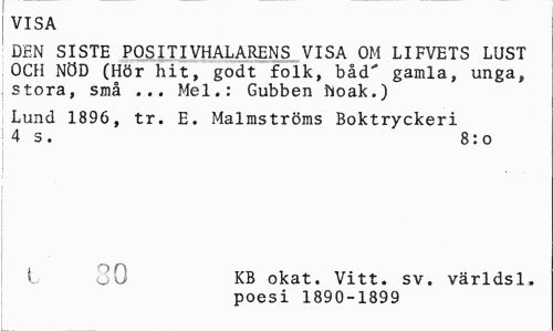 //// VISA //// DEN SISTE POSITIVHALARENS VISA OM LIFVETS LUST OCH NÖD (Hör hit, godt folk, båd' gamla, unga, stora, små ... Mel.: Gubben hoak.) //// Lund 1896, tr. E. Malmströms Boktryckeri 4 s. 8:0 //// t 30 KB okat. Vitt. sv. världs 1. //// poesi 1890-1899 ////