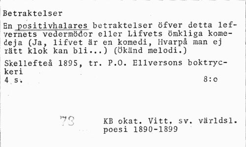 //// Betraktelser //// En positivhalares betraktelser öfver detta lef-vernets vedermödor eller Lifvets ömkliga kome-deja (Ja, lifvet är en komedi, Hvarpå man ej rätt klok kan bli...) (ökänd melodi.) //// Skellefteå 1895, tr. P.O. Ellversons boktryckeri //// 4 s. 8:0 //// KB okat. Vitt. sv. världsl. //// poesi 1890-1899 ////