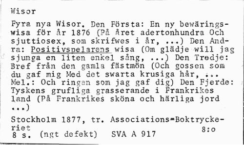 //// Wisor //// Fyra nya Wisor. Den Första: En ny bewärings-wisa för år 1876 (På året adertonhundra Och sjuttiosex, som skrifwes i år, ...) Ben And-ra: Positivsnelarens wisa (Om glädje will jag sjunga en liten enkel sång, ...) Den Tredje: Bref från den gamla fästmön (Och gossen som du gaf mig Med det swarta krusiga hår, ... Mel.: Och ringen som jag gaf dig) Den Fjerde: Tyskens grufliga grasserande i Frankrikes land (På Frankrikes sköna och härliga jord //// Stockholm 1877, tr. Associations«Boktrycke- //// riet 8:0 //// 8 s. (ngt defekt) SVA A 917 ////