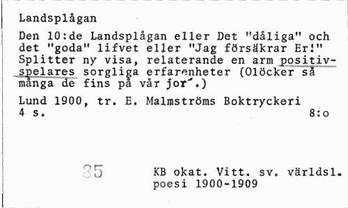 //// Landsplågan //// Den 10:de Landsplågan eller Det "dåliga" och det "goda" lifvet eller "Jag försäkrar Er!" Splitter ny visa, relaterande en arm positiv-spelares sorgliga erfarenheter (Olöcker så manga de fins pa vår Jor'.) //// Lund 1900, tr. E. Malmströms Boktryckeri 4 s. 8:o //// H5 KB okat. Vitt. sv* världsl. //// poesi 1900-1909 ////
