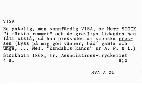 //// VISA //// En ynkelig, men sannfärdig VISA, om Herr STOCK "i första rummet" och de gräsliga lidanden han fått utstå, då han pressades af svenska py,ps-sen (Lyss på mig god vänner, båd" gamla och unga, ... Mel. "Zandahls kanon" ur A. P. & L.) //// Stockholm 1868, tr. Associations-Tryckeriet 4 s. 8:0 //// SVA A 24 ////