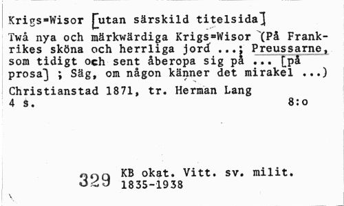 //// Krigs-Wisor £utan särskild titelsida3 //// Twå nya och märkwärdiga Krigs =Wisor "(På Frankrikes sköna och herrliga jord ...: Preussarne, som tidigt och sent åberopa sig pa ... [på prosa^ ; Säg, om någon känner det mirakel ...) //// Christianstad 1871, tr. Herman Lang 4 s. 8:0 //// OOQ KB okat. Vitt. sv. milit. //// O^ö 1835-1938 //// \ ////