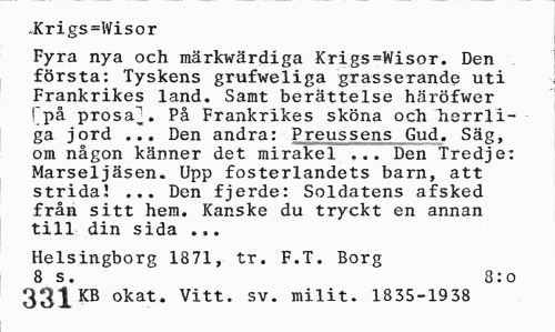 //// .Krigs =Wisor //// Fyra nya och märkwärdiga Krigs=Wisor. Den första: Tyskens grufweliga grasserande uti Frankrikes land. Samt berättelse häröfwer [på prosa^. På Frankrikes sköna och lierrli-ga jord ... Den andra: Preussens Gud. Säg, om någon känner det mirakel ... Den Tredje: Marseljäsen. Upp fosterlandets barn, att strida! ... Den fjerde: Soldatens afsked från sitt hem. Kanske du tryckt en annan till din sida ... //// Helsingborg 1871, tr. F.T. Borg B s 8*0 //// 331KB okat. Vitt. sv. milit. 1835-1938 ////