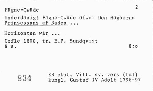 //// 2 //// Fägne=Qwäde //// Underdånigt Fägne=Owäde öfwer Den Högborna Prinsessans af Baden ... //// Horizonten wår ... //// Gefle 1800, tr. E.P. Sundqvist 8 s. 8:o //// , ^ KB okat. Vitt. sv. vers (tal) //// kungl. Gustaf IV Adolf 1796-97 ////