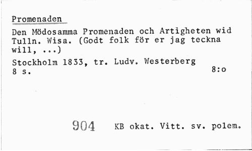 //// Promenaden //// Den Mödosamma Promenaden och Artigheten wid Tulln. Wisa. (Godt folk för er jag teckna will, . „.) //// Stockholm 1833, tr. Ludv. Westerberg 8 s. 8:0 //// 904 KB okat. Vitt. sv. polem. ////