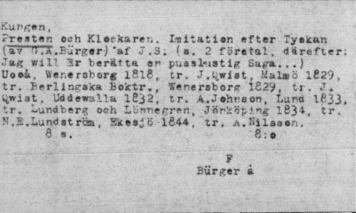 //// Kungen, //// Frestar: °<-'h Klockaren. Imitation efter Tyskan fav (TVA.Bärger) *af J.3. (s, 2 företal. därefter: Jag v/ill 3r berätta sn putslustig Saga...) Uooå, Wer.eroborg l8l8, tr. J.q,wist, Malmö 1629, tr. Berlingaka Boktr., Wenersborsr 1829, tr. J. ^wist, Uddevalla 1232, tr. .4.Johnson, Lund 1833, tr. Lundberg och Lönnegren, Jönköping 1834-, tr. N.S.Lundström, Ekesjö 1844, tr, A.Kilason. 8 s. 8:0 //// t Ä'"" ' * \ //// Burger a ////