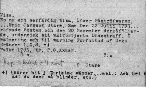 //// Visa. //// En ny och sanfärd ig Wisa, öfwer Påströfwaren, ...Eric Jansson Stare, Som Den 22 JuLirT797.. . röfwade Posten och den 20 No v? em "b er derpåfoljan- //// undergick sit wälfört^jenta Dödsstraff. I välmening och til warning Författad af Unga Drängen L.Q.S, +) Falun 1793, tr. P.O.Axmar. //// 8 ». 8: o //// hMu^ tryj ksydf q stars //// +) (Hörer hit j Christne wänner...mel.; Ack hwi i äst du deck så hlinier, etc.) ////