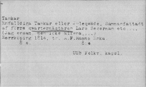 //// OM //// Tankar //// Knfalldipa Tankar e ller wleqwäöe, Sa-nmanfattacit af f ; rr« qtva rt era a sta r t y Lars Se german etc (Jag ers ar. •nV»- w 'i ITe ITTrera , , , . / Korrkt-ping 1814, t r. A.F.Hatuns ICnka 6 8, 8:<» //// UUB Fclkv, kap si. ////