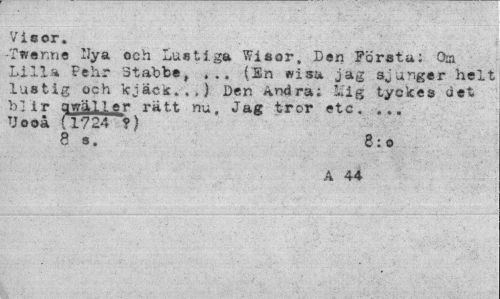 //// Visor. //// -Twerme llya och Lustiga Wisor, Den Företa; Osa Lilla Fe hr 3tabbe, ... ("En «isa jag sjunger helt lustig och kjäck., ,) Den Andra; £Tig tyckes det blir avräll er ratt nu, Jag tror etc. ... Uooå (1724 ?) //// 8 s. 8: o //// A 44 ////