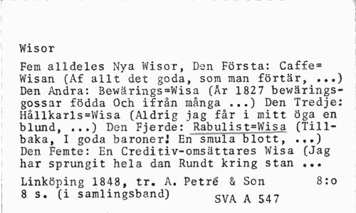 //// Wisor //// Fem alldeles Nya Wisor, Den Första: Caffe= Wisan (Af allt det goda, som man förtär, ...) Den Andra: Bewärings=Wisa (År 1827 bewärings-gossar födda Och ifrån många ...) Den Tredje: Hållkarls=Wisa (Aldrig jag får i mitt öga en blund, ...) Den Fjerde: Rabulist=Wisa (Tillbaka, I goda baronerj En smula blott, ...) Den Femte: En Creditiv-omsättares Wisa (Jag har sprungit hela dan Rundt kring stan ... //// Linköping 1848, tr. A. Petré & Son 8:0 //// 8 s. (i samlingsband) SVA A 547 ////