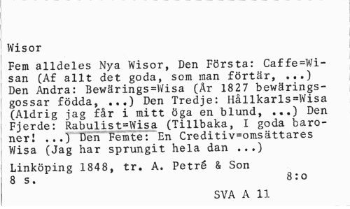 //// Wisor //// Fem alldeles Nya Wisor, Den Första: Caffe=Wi-san (Af allt det goda, som man förtär, ...) Den Andra: Bewärings=Wisa (År 1827 bewärings-gossar födda, Den Tredje: Hållkarls=Wisa //// (Aldrig jag får i mitt öga en blund, ...) Den Fjerde: Rabulist=Wisa (Tillbaka, I goda baroner! ...) Den Femte: En Creditiv=omsättares Wisa (Jag har sprungit hela dan ...) //// Linköping 1848, tr. A. Petré & Son 8 s. 8 :o //// SVA A 816 ////