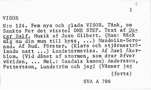 //// 1 //// VISOR //// N:o 124. Fem nya och glada VISOR. Tänk, om Sankte Per det vissteJ ONE STEP. Text af Os-carjcalf. Musik af Jean Gilbert. (Han: Räck mig nu din mun till kyss, ...) Mandolin-Sere-nad* Af Rud. Förs ter. (Klara och stjärnestrålande natt ...) Landstormsvisa. Af Axel Åkerblom. (Vid dånet af stormen, som drar öfver världen, ... Mel.: Sandals kanon) Andersson, Pettersson, Lundström och jagJ (Vänner jag //// (forts) //// SVA A 706 ////