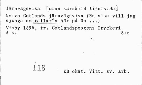 //// Järnvägsvisa [utan särskild titelsida] //// Norra Gotlands järnvägsvisa (En visa vill jag sjunga om rallaren här på ön ...) //// Visby 1896, tr. Gotlandspostens Tryckeri As. 8:0 //// 118 //// KB okat. Vitt. sv. arb. ////