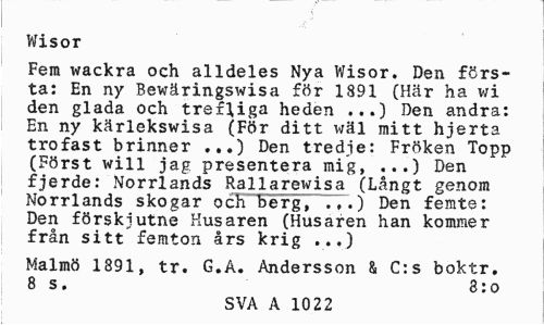 //// Wisor //// Fem wackra och alldeles Nya Wisor. Den första: En ny Bewäringswisa för 1891 (Här ha wi den glada och trefjiga heden ...) Den andra: En ny kärlekswisa (För ditt wäl mitt hjerta trofast brinner ...) Den tredie: Fröken Topp (Först wil1 jag presentera mig, ...) Den fjerde: Norrlands Rallarewisa (Långt genom Norrlands skogar och berg, ...) Den femte: Den förskiutne Husaren (Husaren han kommer från sitt femton års krig ...) //// Malmö 1891, tr. G.A. Andersson & C:s boktr. 8 s. 8:o //// SVA A 1022 ////