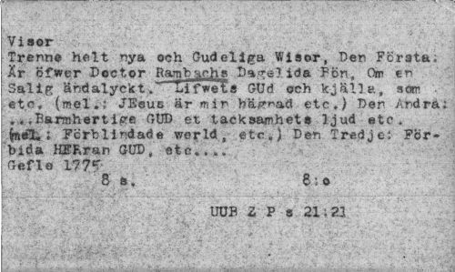 //// Visor //// Trenne helt nya och Gudeliga Vfisor, "Den Första. Är öfwer Doctor Ram b sch» Dajrelida Pön, Om en Salig äbdalyckt. Lifwets Glid och k-jälla, som etc, (mel.? JEsus är ni i r» hägnad etc.) Den Ardra; ., .Barmhertlge GUD et tacksamhets ljud etc. (mel, i Förblindade werld, etc.) Den Tredje; Förbida HERran GUD, etc..., Gefle 177?' //// 8s, 8:o //// UUB Z P 9 21.21 ////