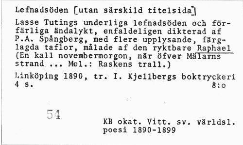 //// Lefnadsöden [utan särskild titelsida3 //// Lasse Tutings underliga lefnadsöden och förfärliga ändalykt, enfaldeligen dikterad af P.A. Spångberg, med flere upplysande, färglagda taflor, målade af den ryktbare Raphael (En kall novembermorgon, när öfver Mälams strand ... Mel.: Raskens trall.) //// Linköping 1890, tr. I. Kjellbergs boktryckeri 4 s. 8:0 //// 5 4 //// KB okat. Vitt. sv. världsl. poesi 1890-1899 ////