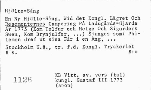 //// Hjälte=Sång //// En Ny Hjälte=Sång, Wid det Kongl. Lägret Och Regementernes Campering På Ladugårds=Gjärde År 1773 (Kom Telfur och Helge Och Sigurders Sv/en, Kom Brynjulfer, ...) Sjunges som: Phi-lemon dre£ ut sina Får i en Äng, ... //// Stockholm U.å., tr. £.d. Kongl. Tryckeriet 8 s, 8:0 //// , . , KB Vitt. sv. vers (tal) //// 112b kungl. Gustaf III 1773 //// (anon) ////