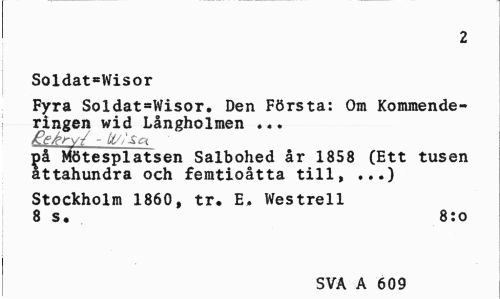 //// 2 //// Soldat=Wisor //// Fyra Soldat^Wisor. Den Första: Om Kommende-ringen wid Långholmen ... //// - U/jsci //// på Mötesplatsen Salbohed år 1858 (Ett tusen åttahundra och femtioåtta till, ...) //// Stockholm 1860, tr. E. Westrell 8 s. 8:o //// SVA A 609 ////