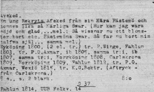 //// ivsked. //// R'n ung Rekryts. Åfsked från sin Kära Fastemö och lennes lika så Karl i Swar. (Hur kan jag wara *cjd och glad .mel.: 3å wissnar nu ett blomster fcort etc. FUstemöna Svar. 3å far ^u bort r.in lälfwa själ... samma mel.) //// Nyköping 1P00, (2 o "I. tr.) tr. P.Winge, Fahlun 1803, tr. F.Ö.Åxmar, ib 1805, samma tr:i, ib L807, samma tr:i, vorrköpi^fr 1808, farl a<ro"a L?09, Norrköping 1809, ^ahlun l8l?t tr. P.O. ^xmar, Wexiö l8l^, tr. K.G.Boktr. (Aftryck -fra^ Carlskrcna.) //// B s., s. 2 blank. 8:0 //// £ 37 //// Pahlun 1814. UUB Folk v. 14 ////