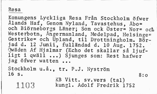 //// Resa //// Konungens Lyckliga Resa Från Stockholm öfwer Ålands Haf, Genom Nyland, Tavastehus, Åbo= och Biörneborgs Läner; Som ock öster= Nor= oci Westerbotn, Ångermanland, Medelpad, Helsinge= Gestrike= och Uoland, til Drottningholm. Börjad d. 12 Junii, fulländad d. 10 Aug. 1752. Qwäden Af Hjalmar (Echo det skallar så ljuf-ligt i qwäll ...) Sjunges som: Rest hafwer jag öfwer watten ... //// Stockholm u.å., tr. P.J. Nyström 16 s. 8:o //// KB Vitt. sv.vers (tal) 1103 kungl. Adolf Fredrik 1752 ////