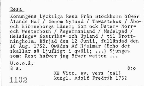 //// Resa //// Konungens Lyckliga Resa Från Stockholm öfwer Ålands Haf / Genom Nyland / Tawastehus / Åbo-och Biörneborgs Läner; Som ock öster= Norr= och Westerbotn / Ångermanland / Medelpad / Helsinge= Gestrike= och Upland / til Drottningholm. Börjad den 12 Junii, fulländad den 10 Äug. 1752. Qwäden Af Hjalmar (Echo det skallar så ljufligt i qwäll; ...) Sjunges som: Rest hafwer jag öfv/er v/atten ... //// U.o.o.å. //// 8 s. 8: o //// KB Vitt. sv. vers (tal) 2102 kungl. Adolf Fredrik 1752 ////