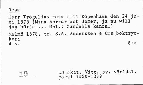 //// Resa //// Herr Trögelins resa till Köpenhamn den 24 juni 1878 (Mina herrar och damer, ja nu will jag börja ... Mel.: Zandahls kanon.) //// Malmö 1878, tr. S.A.,Andersson & C:s boktryckeri //// 4 s. 8: o //// I //// i q KB okat. Vitt. sv. världsl. //// ^ ° poesi 1850-1329 ////
