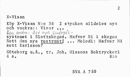 //// 2 //// X-Visan //// Köp X-Visan N:o 38 2 stycken alldeles nya och vackra:: Visor ... //// £W on^dira: •Åe/ »y^ c //// systemet i Slottskogeri. Hafver Ni i skogen Sett den nya restrantJ ... Melodi: Hafver Ni sett Karlsson? //// Göteborg u.å., tr, Joh. Olssons Boktryckeri 4 s. 8:o //// SVA A 7 50 ////