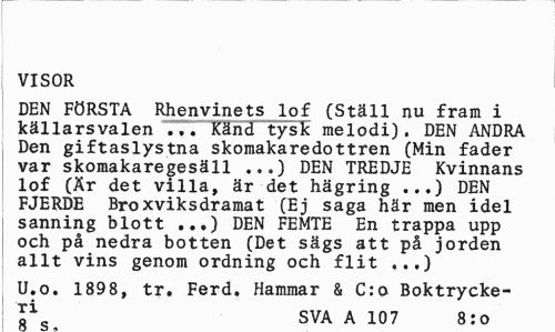 //// VISOR //// DEN FÖRSTA Rhenvinets lof (Ställ nu fram i källarsvalen T,. Känd tysk melodi). DEN ANDRA Den giftaslystna skomakaredottren (Min fader var skomakaregesäll ...) DEN TREDJE Kvinnans lof (Är det villa, är det hägring ...) DEN FJERDE Broxviksdramat (Ej saga här men idel sanning blott ...) DEN FEMTE En trappa upp och på nedra botten (Det sägs att på jorden allt vins genom ordning och flit ..,) //// U.o. 1898, tr. Ferd. Hammar & C:o Boktrycke- //// I* SVA A 107 8:0 ////