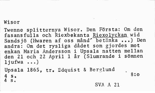 //// Wisor //// Twenne splitternya Wisor. Den Första: Om den fasansfulla och Riexbekanta Riexolyckan wid Sandsjö (Hwaren af oss månd' betänka Den //// andra: Om det rysliga dådet som gjordes mot enkan Maria Andersson i Upsala natten mellan den 21 och 22 April 1 år (Slumrande i sömnen ljufwa ...) //// Upsala 1865, tr, Edquist & Berglund 4 s, 8:o //// 4 s. //// SVA A 21 7 ////