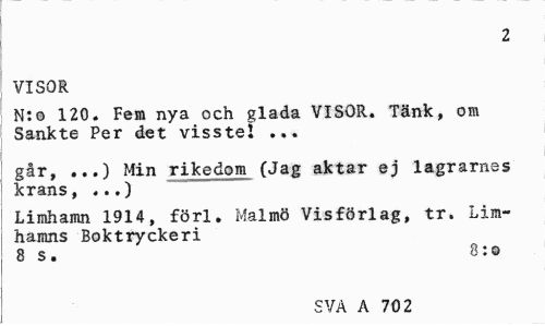 //// 2 //// VISOR //// N:o 120. Fem nya och glada VISOR. Tänk, om Sankte Per det visste! ... //// går, ...) Min rikedom (Jag aktar ej lagrarnes krans, ...) //// Limhamn 1914, förl. Malmö Visförlag, tr. Limhamns Boktryckeri //// 8 s. 8:o //// SVA A 702 ////
