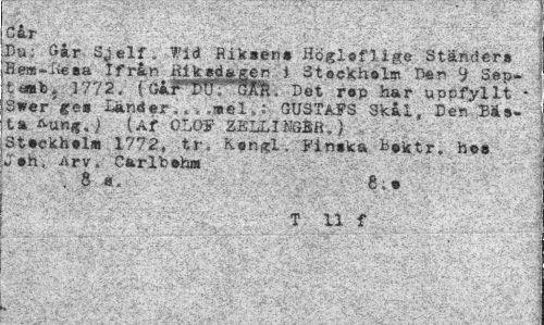 //// Cår - //// Du; Går SJ.elf. Wid Riksena HöglofUge Ständer» Eea-Wsa Ifrån Rik ed a gen i Stockholm Den 9 Sep» tm\t 1772. (G&mrm. Det rep har uopfyllt • Swerges Länder.»el,: GUSTAFS Skål, 13en B*s« ta ) {Af OLOF ZELLIKGBhJ //// Stockholm 1772, tr, Kongl. Fin »k a b©ktr. ho» v oh. Arv» Carlbohm //// . 8 a. 6; o //// T 11 f ////