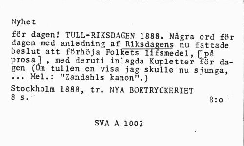 //// Nyhet //// för dagen! TULL-RIKSDAGEN 1888. Några ord för dagen med anledning af Riksdagens nu fattade beslut att förhöja Folkets lifsmedel, [på prosa") , med deruti inlagda Kupletter för dagen (öm tullen en visa jag skulle nu sjunga, ... Mel.: "Zandahls kanon".) //// Stockholm 1888, tr. NYA BOKTRYCKERIET 8 s. S:o //// SVA A 1002 ////