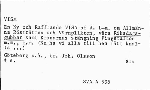 //// VISA //// En Ny och Rafflande VISA af A. L-m. om Allmänna Rösträtten och Värnplikten, våra Riksdags^ gubbar samt Krogarnas stängning Pingstafton m.m., m.m. (Nu ha vi alla till hea fått knalla ...) //// Göteborg u.å., tr. Joh. Olsson 4 s. 8:0 //// SVA A 8 38 ////