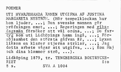//// POEMER //// UTI HVARJEHANDA ÄMNEN UTGIFNA AF JUSTINA MARGARETA NYSTRÖM. (Hör tempelklockan hur hon ljuder, .,.; Den svenske mannen går pröfningen emot, ...; Regeringen med riks-jlagsmäi^ försöker att väl ordna, ...; De fartyg som uti Lidköpings hamn ingå, .,.; Förnöjsamhet den största gåfvan är, Lyxen liksom en klarer stjerna strålar, ...; Jag detta arbete vågar att utgifva, ...; Kom Maj och dina blommor strö, ...). //// Lidköping 1879, tr. TENGBERGSKA BOKTRYCKERIET 8:0 8 s. SVA A 1004 ////