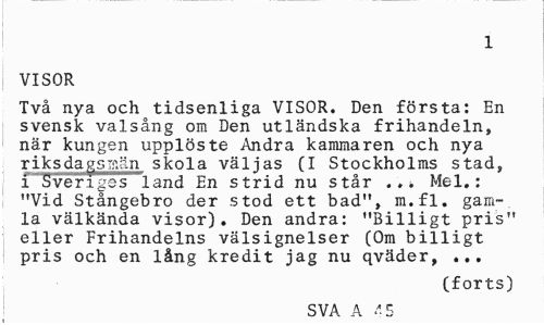 //// 1 //// VISOR //// Två nya och tidsenliga VISOR. Den första: En svensk valsång om Den utländska frihandeln» när kungen upplöste Andra kammaren och nya riksdagsmän skola väljas (I Stockholms stad, i Sveriges land En strid nu står ..» Mel.: "Vid Stångebro der stod ett bad", m.fl. gamla välkända visor). Den andra: "Billigt pris" eller Frihandelns välsignelser (Om billigt pris och en lång kredit jag nu qväder, ... //// (forts) //// SVA A -5 ////