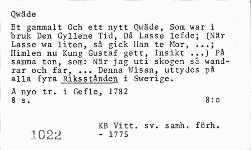 //// Qwäde //// Et gammalt Och ett nytt Qwäde, Som war i bruk Den Gyllene Tid, Då Lasse lefde; (När Lasse wa liten, så gick Han te Mor, . Himlen nu Kung Gustaf gett. Insikt ...) På samma ton, som: När jag uti skogen så wand-rar och far, ... Denna V/isan, uttydes på alla fyra Riksstånden i Swerige. //// Å nyo tr. i Gefle, 1782 //// 8 s. 8:0 //// KB Vitt. sv. samh. förh. 1022 - 1775 ////